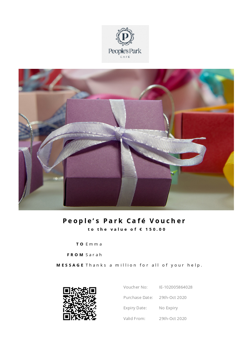 People’s Park Cafe allows you to purchase instantly printable gift vouchers, special offers and tickets using the Voucher Connect platform.
